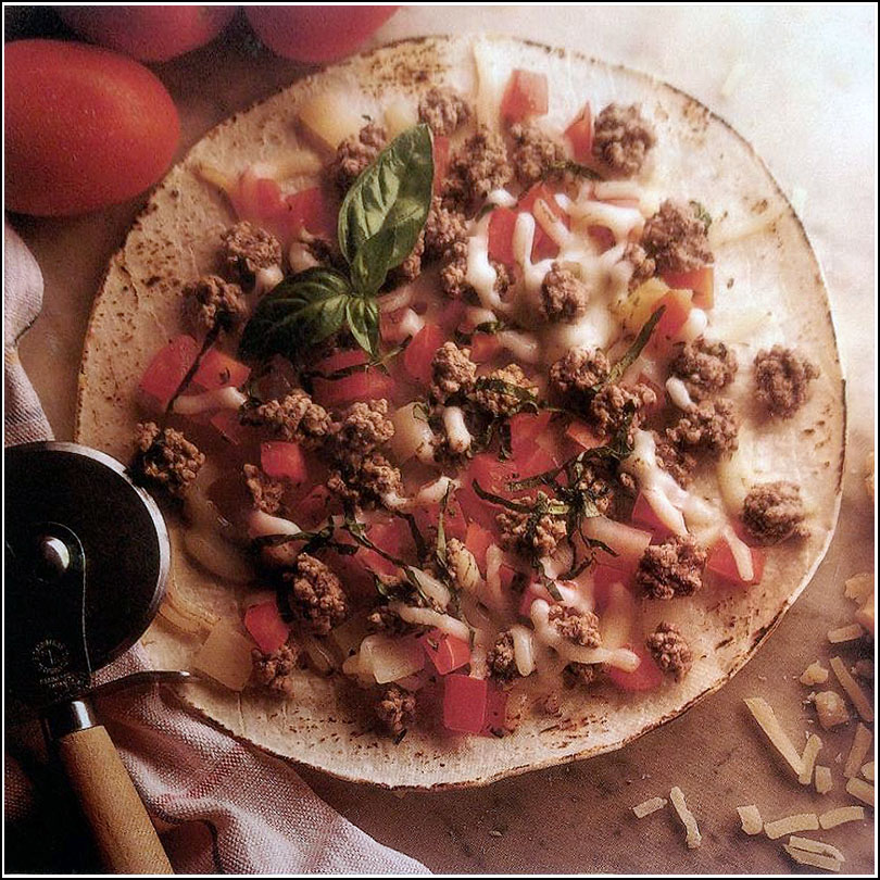 - Spoon beef mixture evenly over the top of each tortilla; top with an equal amount of tomato. Sprinkle with basil and cheeses.