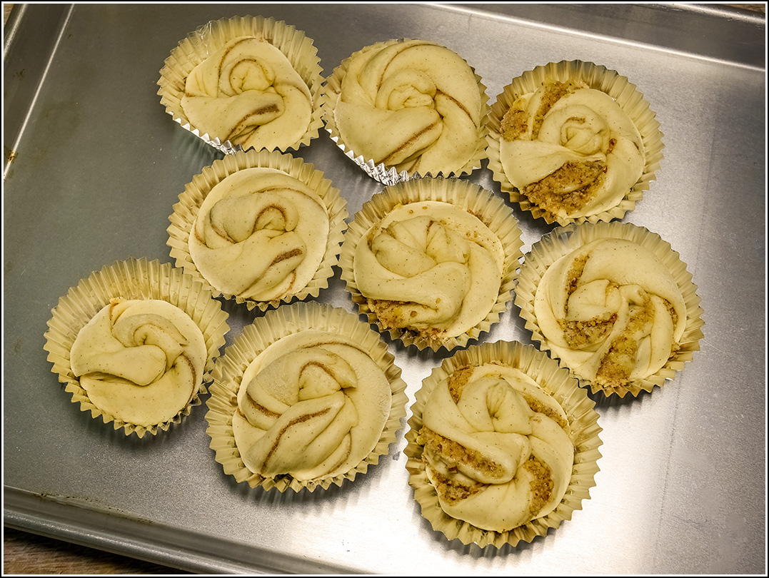 Using and offset spatula, spread the filling over the entire surface in an even layer. Fold the dough in half lengthwise and slice into 2 cm strips. Twist the dough, and then form a bun by curling the dough around itself.