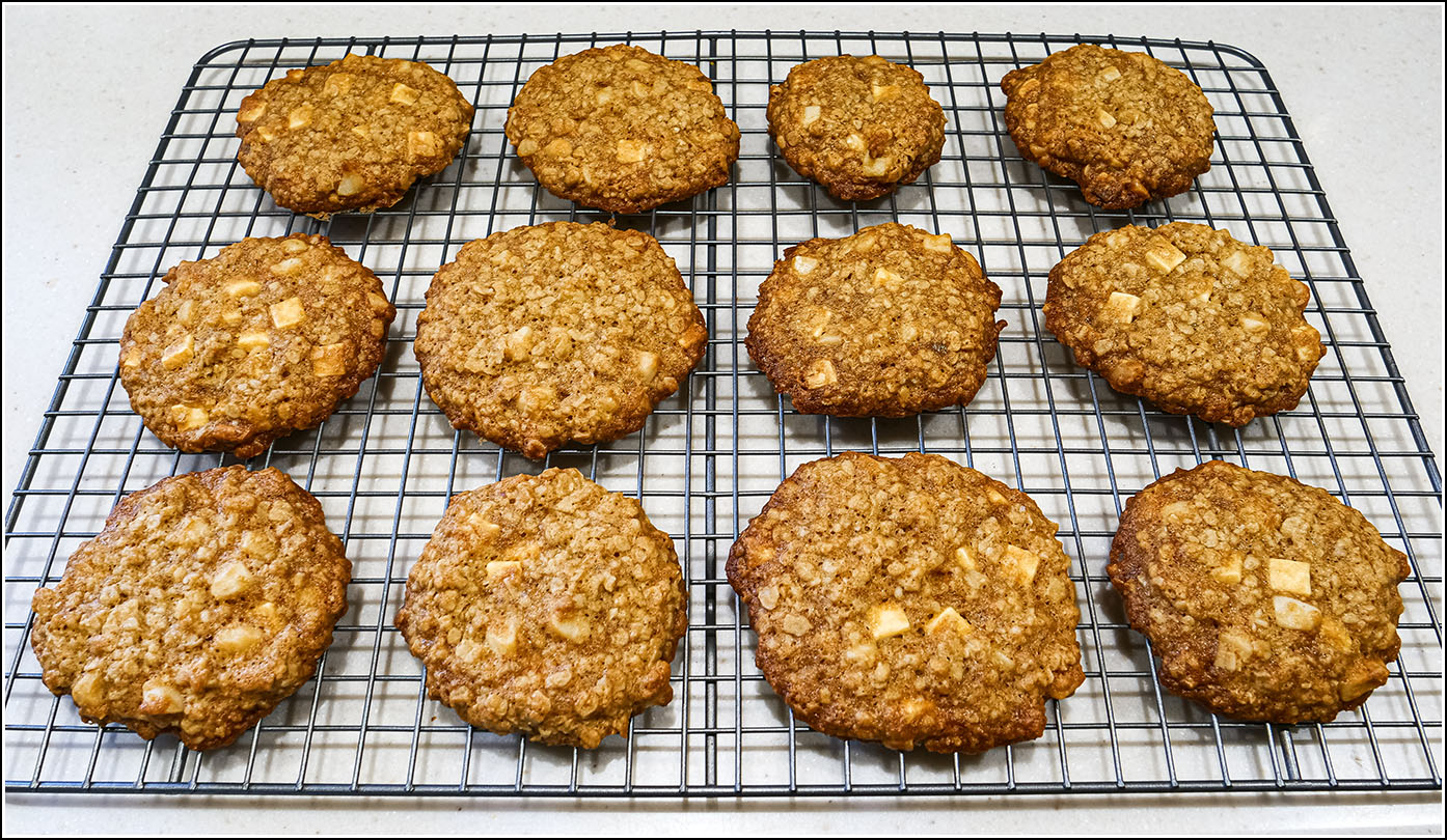 12 October 2025: I made these this morning after not making them for a long time. I have been unable to find real white chocolate chips like I used to use. So instead I tried chopping up a white chocolate bar from Ghirardelli, which seemed to work fine. The cookies baked on rack 2 for about 11 minutes, 30 seconds, which seemed to be perfect. They spread a little bit at the edges, but this can be helped by nudging them back into shape carefully while baking and also as soon as they come out of the oven. I let them cool for about 5 minutes on the cookie sheet (just enough time to make the second half batch of 6 cookies) and then transferred them to the cooling rack. While baking the first half-batch, I refrigerated the dough for the second half-batch, but I’m not sure if it made much difference.