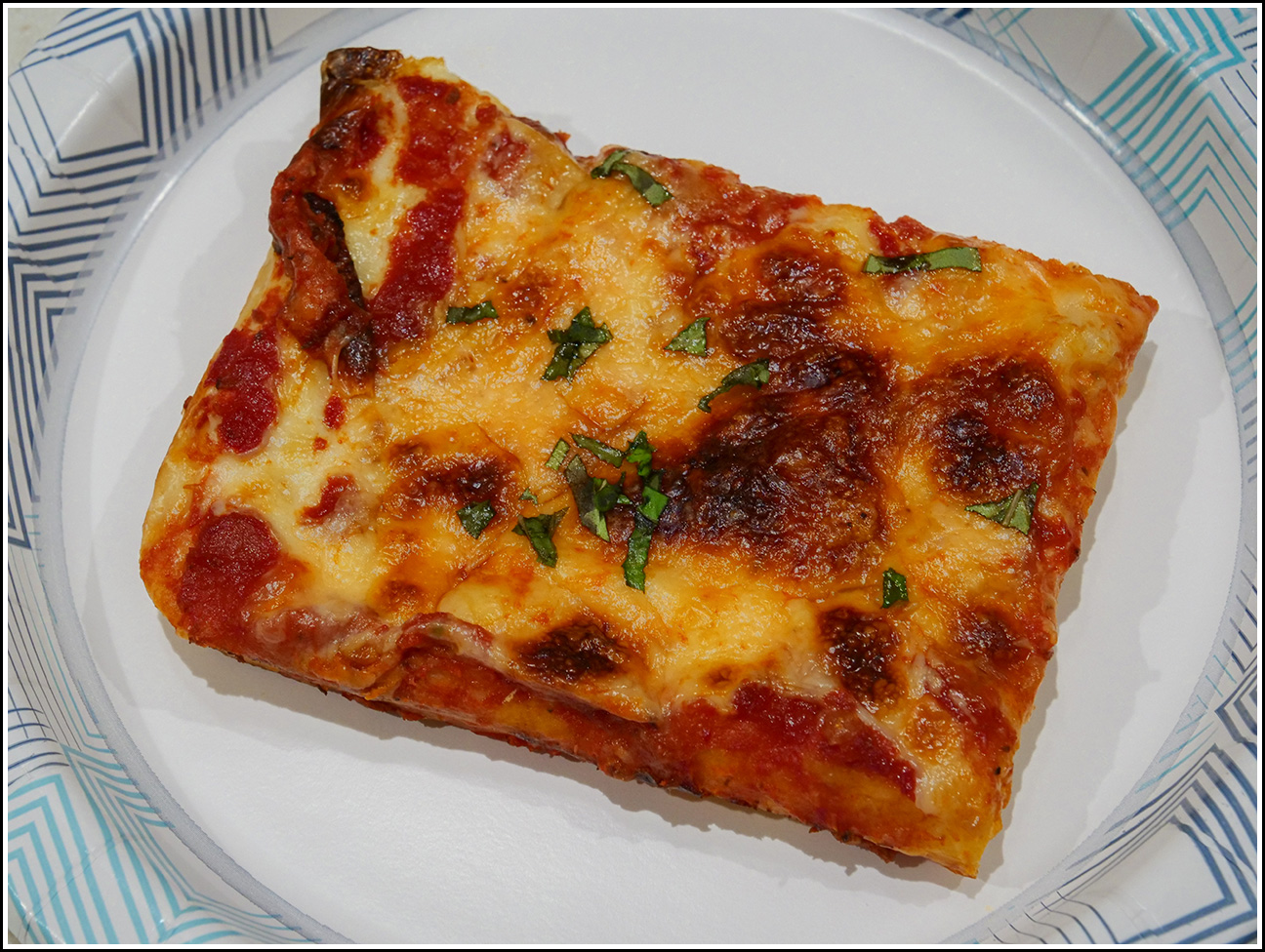 20 July 2024: We have really been enjoying a white version of the grandma pizza; we’ve made a few over the past few weeks. Today we made the best one yet. We used Cooper sharp cheese, cut into small squares and laid out in a 5x5 grid on the crust. We brushed the cheese with about 1 tablespoon of extra-virgin olive oil, and then sprinkled all over with about 3 sprigs of fresh rosemary, finely chopped. Sprinkled with black pepper and then 3-4 chopped green onions, and topped with 4 ounces of shredded mozzarella and 1.5-2 ounces shredded Havarti. We baked it on rack 1 at 450°F for 7 minutes, rotated the pan 180° and then baked another 7 minutes until cheese was golden brown. It’s best to remove it from the pan as soon as possible, and let cool and crisp up on a cooling rack for a few minutes if necessary. Although this looked like too much rosemary and onions, I wanted to make a note to remind us that it was perfect!