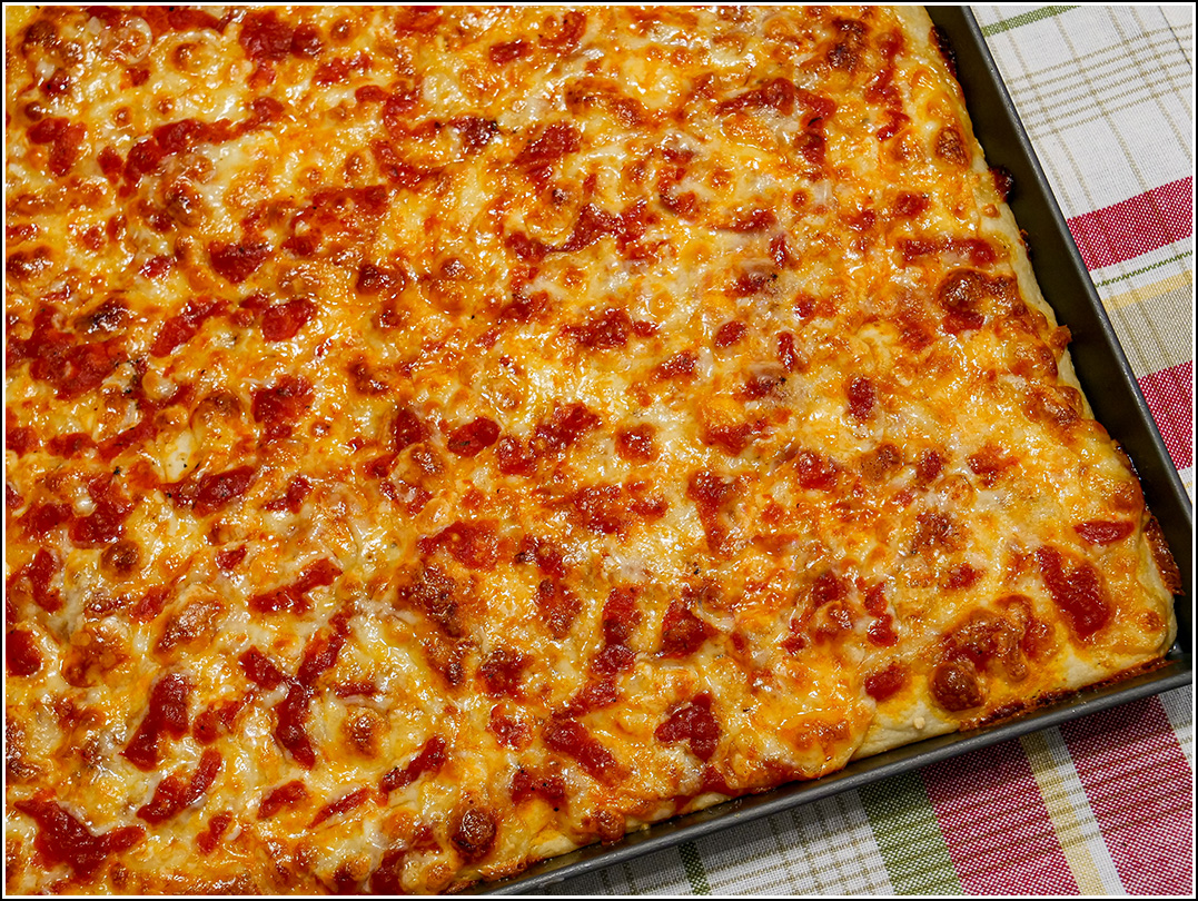 This recipe for Grandma Pizza is derived from Sip and Feast. I really like his dough recipe, although we use our own toppings. And because we use American cheese (and don't like the pizza or cheese to get too brown) we bake it for less time.