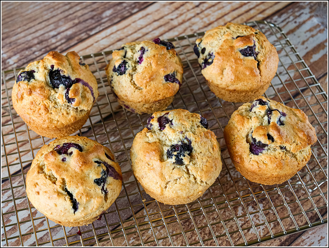 - Bake on rack 2 for 18-20 minutes, until a cake tester inserted into the center of a muffin comes out clean. Remove from oven and tip the muffins in their pan so the bottoms don’t get soggy. After 5 minutes, remove muffins to cooling rack. Serve plain or with butter and/or jam.