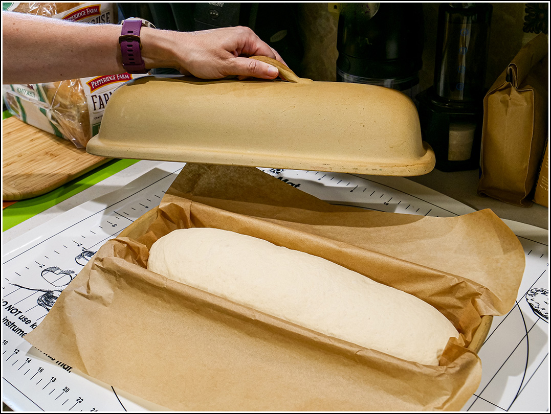 - With a sharp knife, cut 2 or 3 slashes in the top of the loaf. Brush the top of the loaf with cold water, cover the baker with the lid, and bake at 400°F for 30-40 minutes, removing the lid for the final 10 minutes until the loaf is golden brown in color. (I bake mine about 25 minutes with the lid on, and then about 10 with it off.)