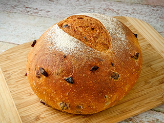 - When the bread is risen, score the top with a sharp blade. Use the parchment sling to place the dough into the Dutch oven, and cover with the lid. Immediately reduce the oven temperature to 400°F and bake for 45 minutes. Remove lid and bake about 5 minutes more.