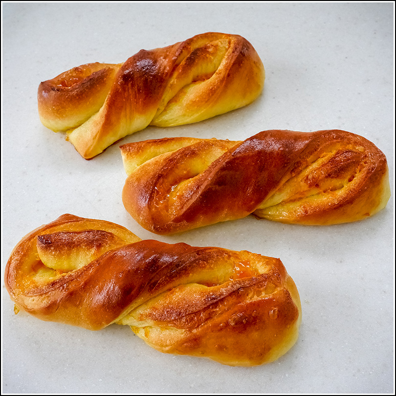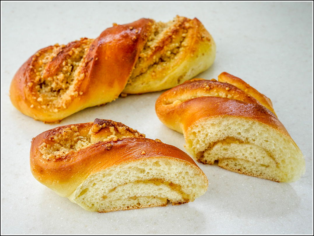 These are fantastic made with salted Kerrygold Irish butter! It works to make up the full recipe of sweet dough but use only half at a time, refrigerating the other portion for a few days. If using half the dough, roll out to an 9x12-inch rectangle (or 9x9 square is fine, because the dough tends to pull a bit when folding it over the filling) and cut into 9 rolls. Also works well with a nut filling: grind 4 ounces of nuts and add to ¼ cup sugar. Half of the dough also works perfectly with the King Arthur Flour bun pan. Roll into a 16x8-inch rectangle, add filling, roll, and cut into 6 slices. Let rise 45-60 minutes, and brush with egg wash. Bake at 375°F for about 16 minutes (I raise the rack up one from where I usually have it so the bottoms don't burn), tenting with foil if browning too quickly. This also works well with apricot lekvar as a filling; in that case I twist the buns as I do the cardamom buns.