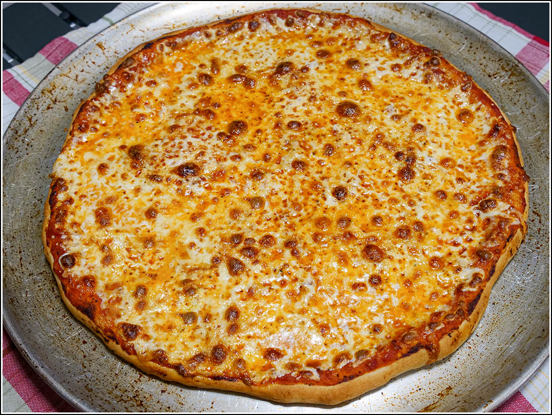 16 July 2022: Today we made this pizza with an unusual mixture of cheeses, which I liked but Rich didn’t care for (Colby-Jack, yellow Cooper, and Clearfield white American). When using a cheese mix that is all or predominantly American-style processed cheese, we have been heating the oven and stone to 450°F, rather than 550°F. Sometimes we turn the oven off when we put the pizza in, and sometimes we leave it on. Bake time is similar, close to 10 minutes. Just watch carefully because some American cheeses brown suddenly and can quickly overbrown.