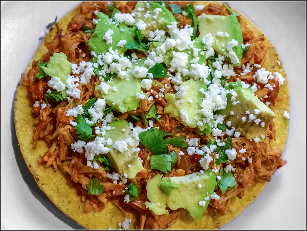 Serve on tostada shells with cheese, avocado pieces, cilantro and lime.